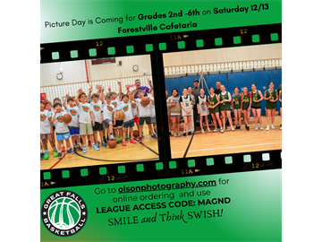 Picture Day for Great Falls Basketball is this Saturday, December 13th, at the Forestville Elementary School Cafeteria. Pictures are for House League teams in grades 2–5. If other teams would like to have photos taken, please coordinate with your coach to sign up for an available time slot.